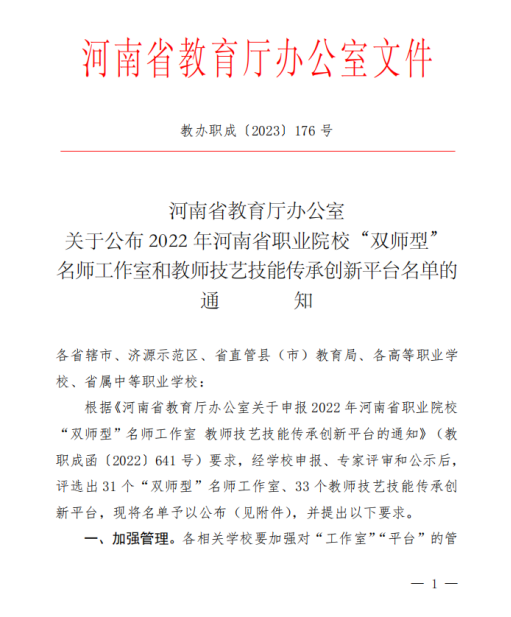 近日,河南省教育厅办公室印发了《河南省教育厅办公室关于公布2022年河南省职业院校“双师型”名师工作室和教师技艺技能传承创新平台名单的通知》(教办职成[2023]176号),公司VSport刘蕴教授作为主持人申报的计算机应用技术专业“双师型”名师工作室成功获批,这是公司“双师型”教师团队建设取得的又一重大成果。