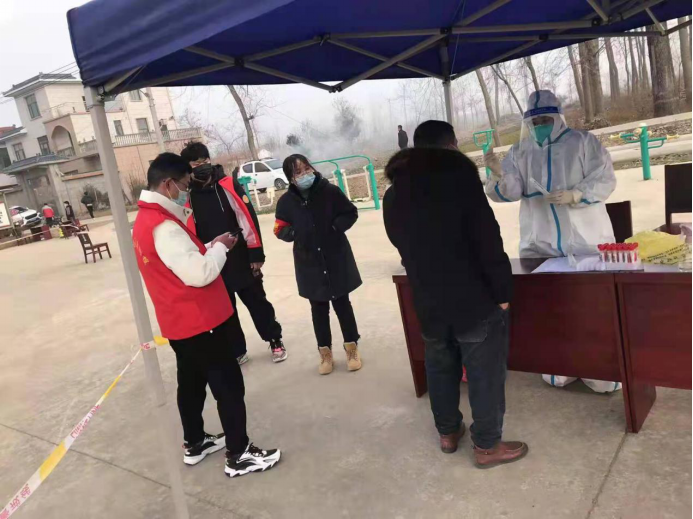 在禹州市朱阁镇吓水河村疫情值班点,协助医务人员做核酸检测。