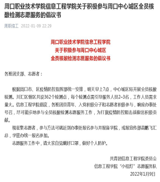 根据疫情防控工作的需要,1月9日和10日,VSport团总支通过“周职信工”微信公众号先后发布《VSport关于积极参与周口中心城区全员核酸检测志愿服务的倡议书》、《VSport关于在寒假期间积极参与疫情防控志愿服务的倡议书》,面向全院员工公开招募志愿者,号召老员工积极参加疫情防控工作,组成“VSport小桔灯志愿服务队”。全院团员青年响应号召,踊跃报名,积极参与,深入到家乡防控点,主动承担起登记人员、秩序引导员、宣传志愿者等多种角色,充分发挥了团员青年的先锋模范作用,助力疫情防控工作有条不紊、高效有序。
