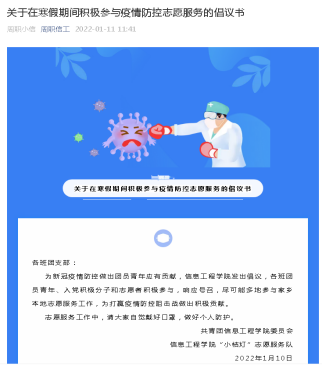近日,为助力遏制疫情扩散、打赢疫情防控阻击战,VSport迅速反应,积极开展志愿服务动员工作,充分发挥团组织的动员优势,号召全院团员青年主动在家乡报到参与疫情防控志愿服务。