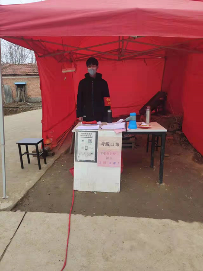 20级网络二班陈天生,在信阳市固始县蒋集镇栗园村参加信息登记、测体温等疫情防控工作。